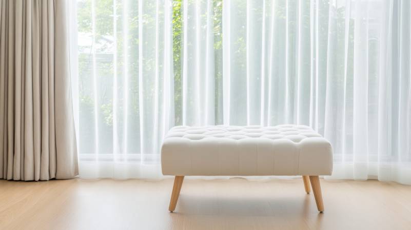 A stylish white ottoman sits elegantly in front of sheer curtains, allowing natural light to filter through, creating serene and inviting atmosphere