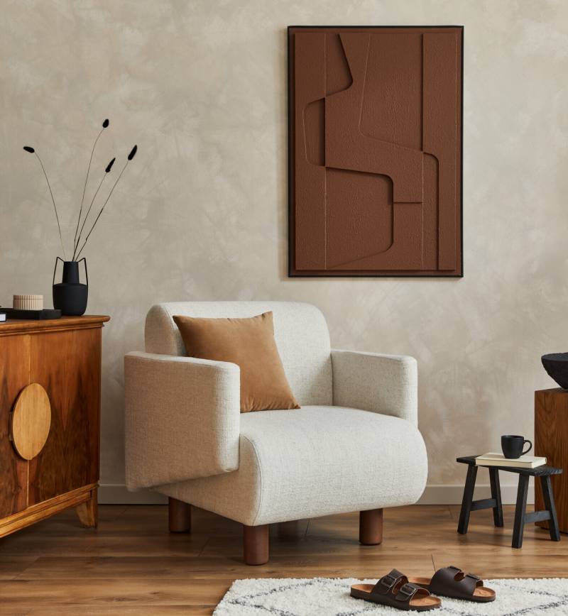 Stylish composition of modern cozy living room interior with structure painting , beige armchair, wooden vintage commode and personal accessories. Creative wall, carpet on the parquet floor. Template.