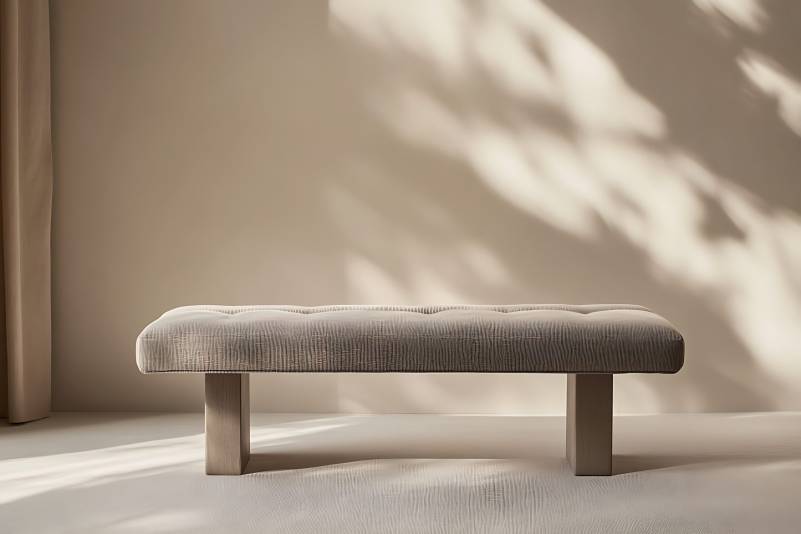 A modern bench with gray upholstery in a minimalist interior.