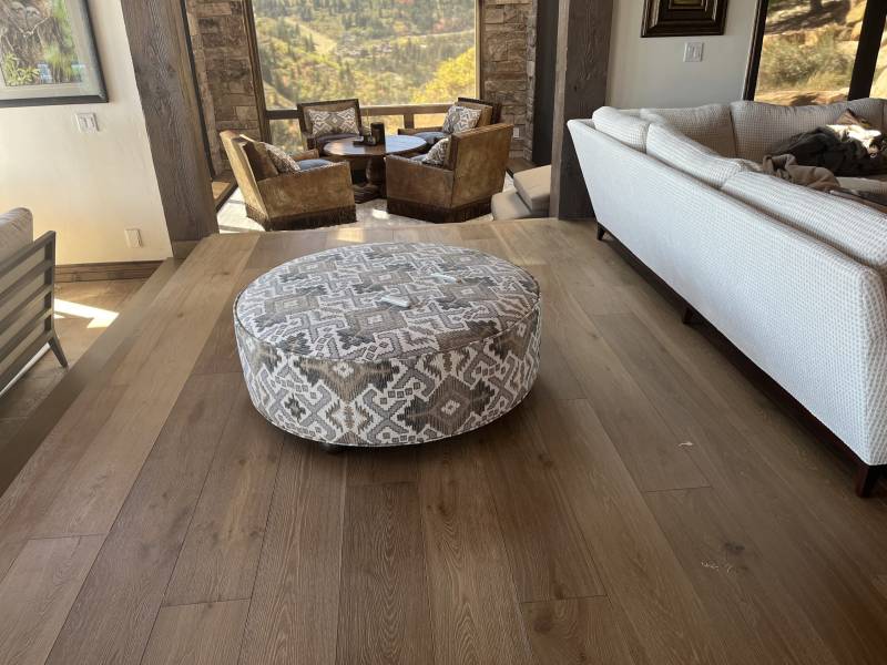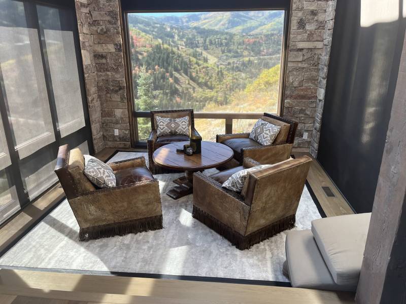 A large, modern living room with floor-to-ceiling windows offering a panoramic view of a sunset over rolling hills. A beige sectional sofa is arranged around a low coffee table on a light-colored rug.