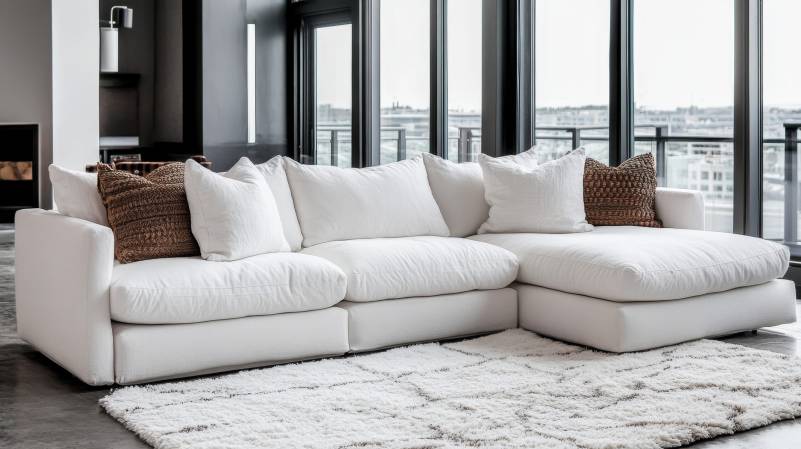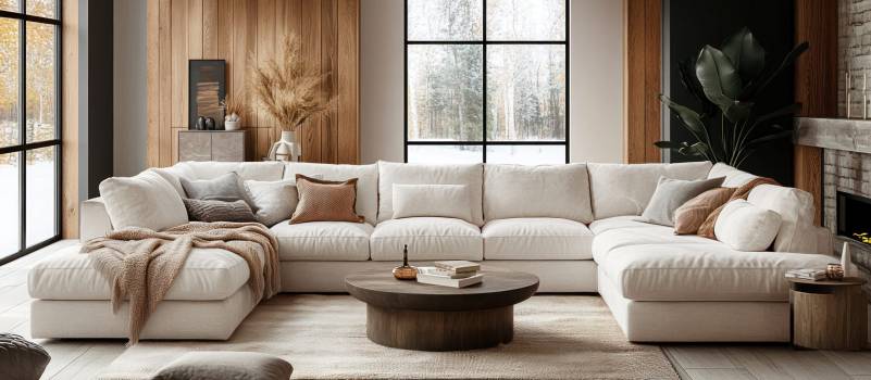 White sectional sofa with wooden coffee table in modern living room.