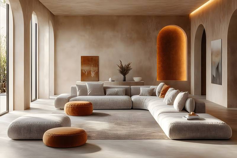 richly designed luxury living room with warm brown and beige tones, featuring light gray lounge furniture and an empty microcement background for art, creating a mockup room suitable for an office r