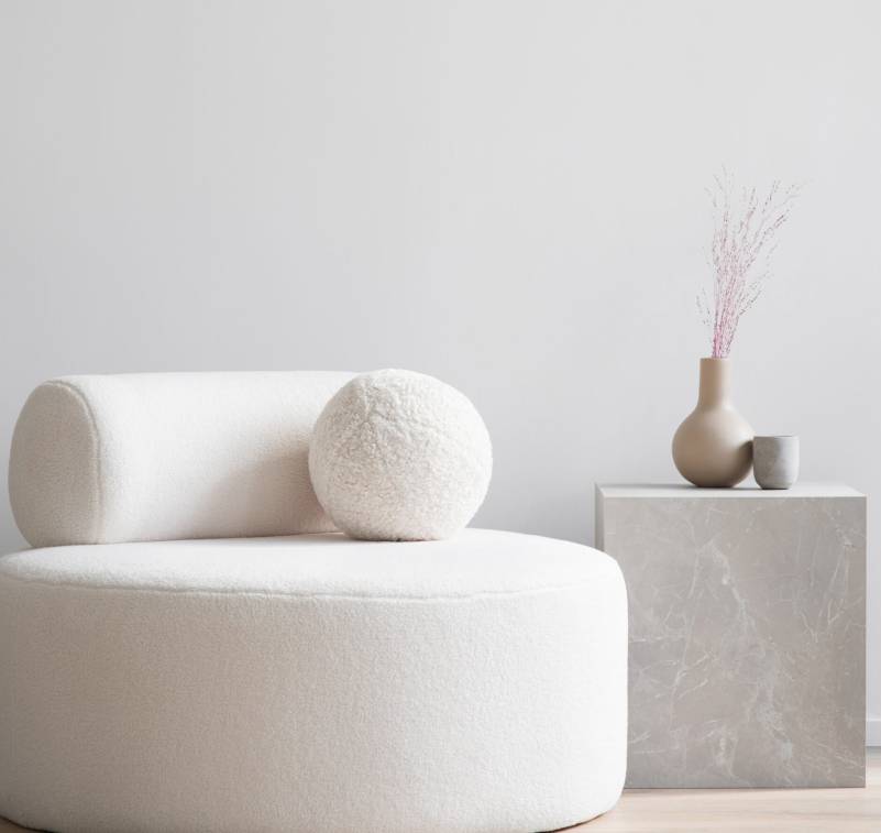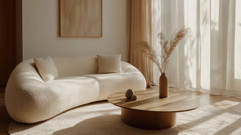 Minimalist, loft home interior design of modern serene and cozy living room with cream boucle sofa and minimalist circular coffee table.