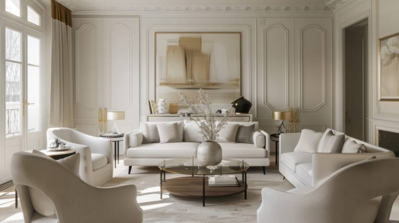 An elegant and refined living room design with a white canvas backdrop, Minimal furniture arranged with precision, French Provincial Minimalism style
